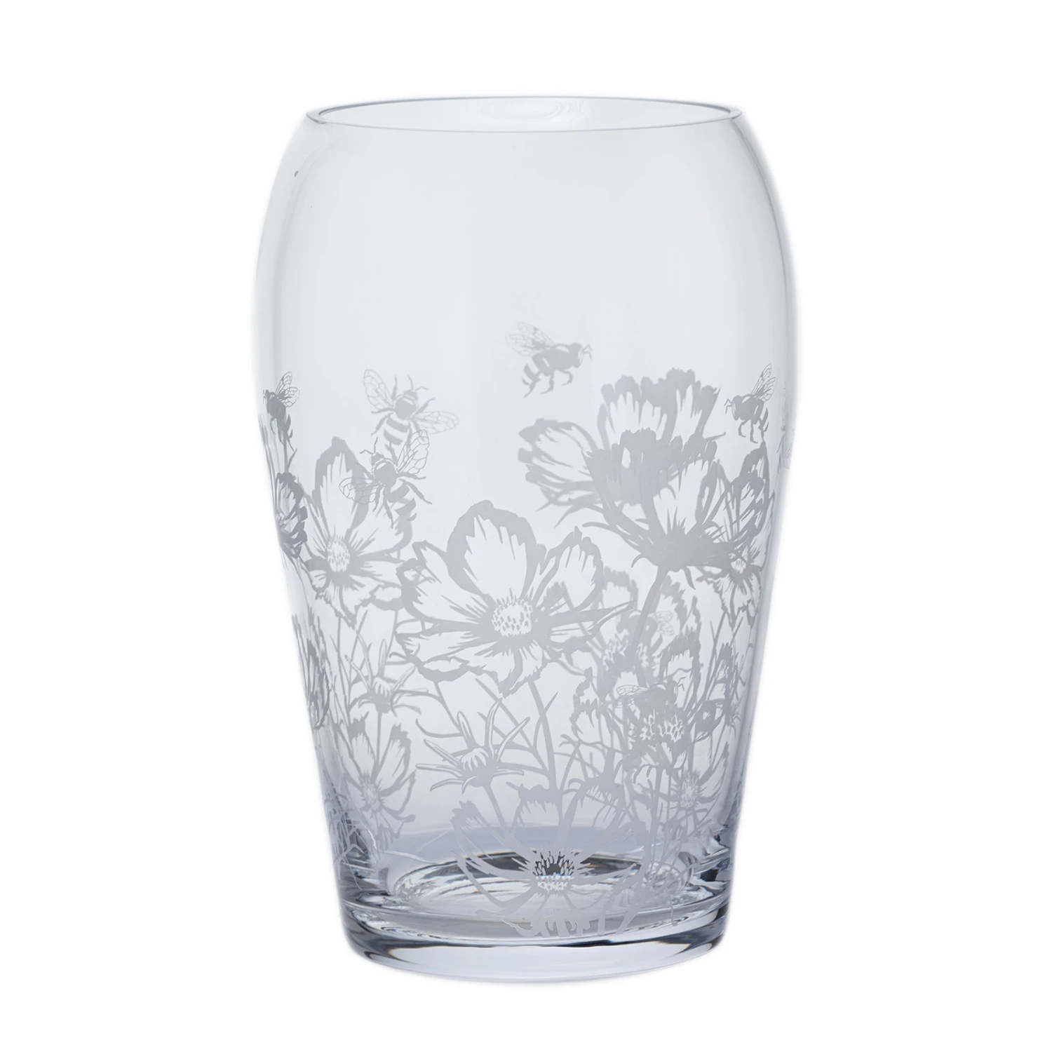 Bloom is a collection of lovely hand-made vases, each elegantly finished with an etch-decorated bloom. This stunning wide profile vase is decorated with Bees & Cosmos. It is a perfect gift or addition to your living space.