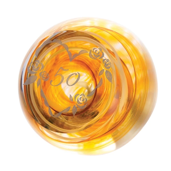Mark a golden milestone with this elegant 50th anniversary paperweight. Layers of swirling yellow and amber glass create a sense of momentous joy. A subtle heart motif encased within commemorates affection and memories. Handcrafted by Caithness artisans, this is the perfect golden anniversary or jubilee gift.