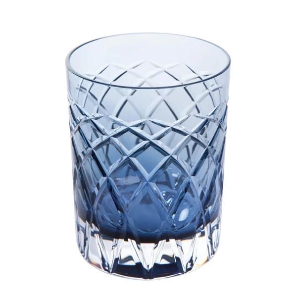 Deep coloured blue crystal is accented with a solid clear base to give a striking effect. A sturdy glass that makes a great way to enjoy a good whisky or other favourite spirit. Mouth blown in England and hand decorated with sweeping cuts that add to the brilliant sparkle. Made of luxury weight crystal this piece makes a lovely gift.