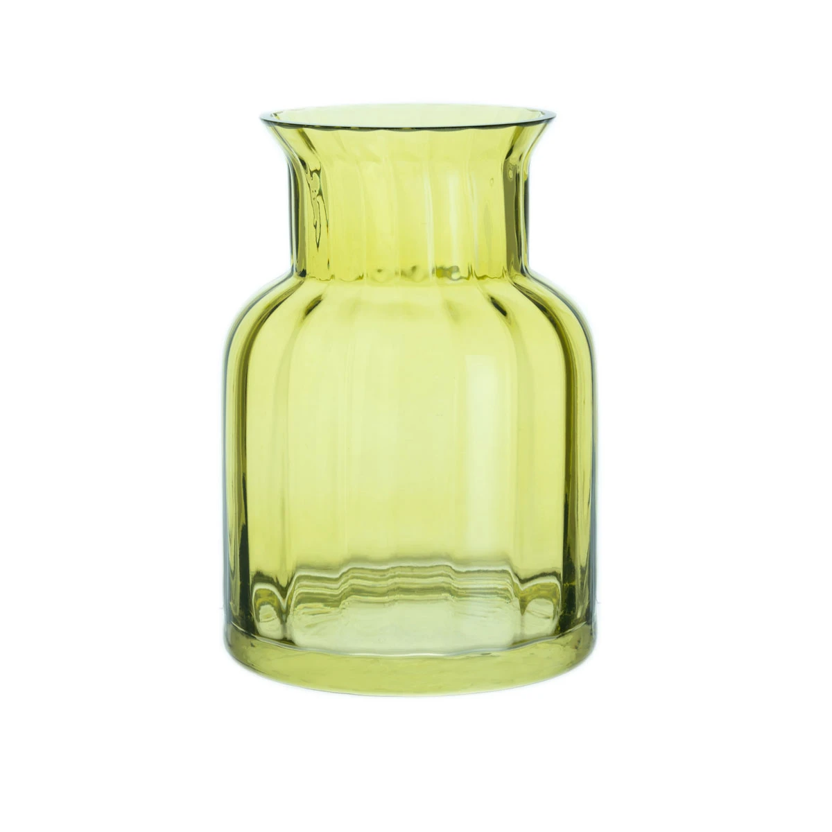 The Jones vase features a distinctive vertical optic pattern, with crisp ridges running from base to rim. This unique texture creates a captivating interplay of light and shadow, adding depth and visual interest to the vibrant green hue. Its medium size offers versatility, perfect for displaying statement bouquets or making an impact as a standalone decorative object.
