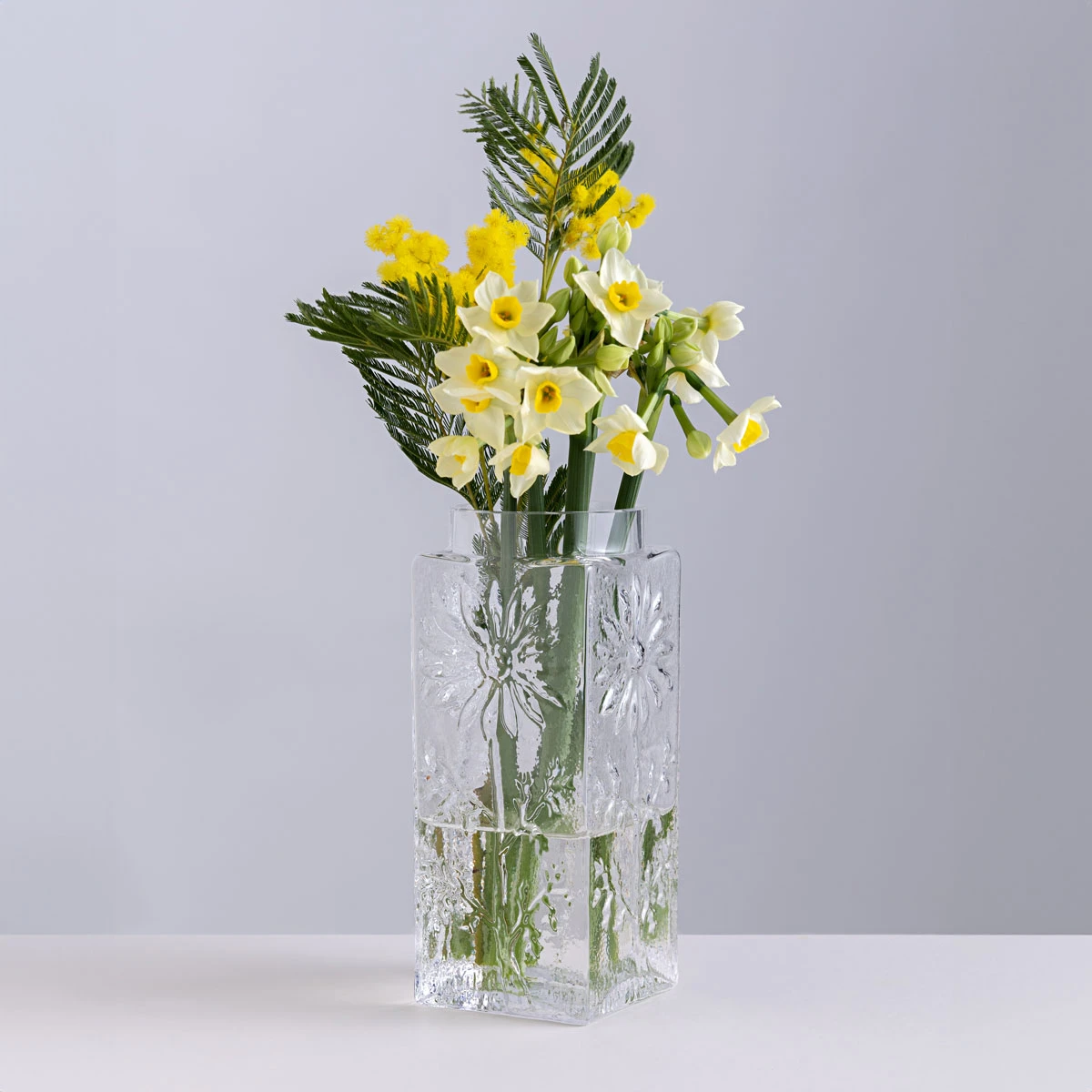 The Marguerite Tall Clear Vase is part of a collection that has stood the test of time, originally designed in 1978 by Frank Thrower. Re-created as a truly authentic hand-made look with an embossed daisy design detail, it is a stunning accessory for the home. Add interest to an empty corner or display centre stage in any room setting. This vase makes a beautiful gift and looks great with or without flowers.