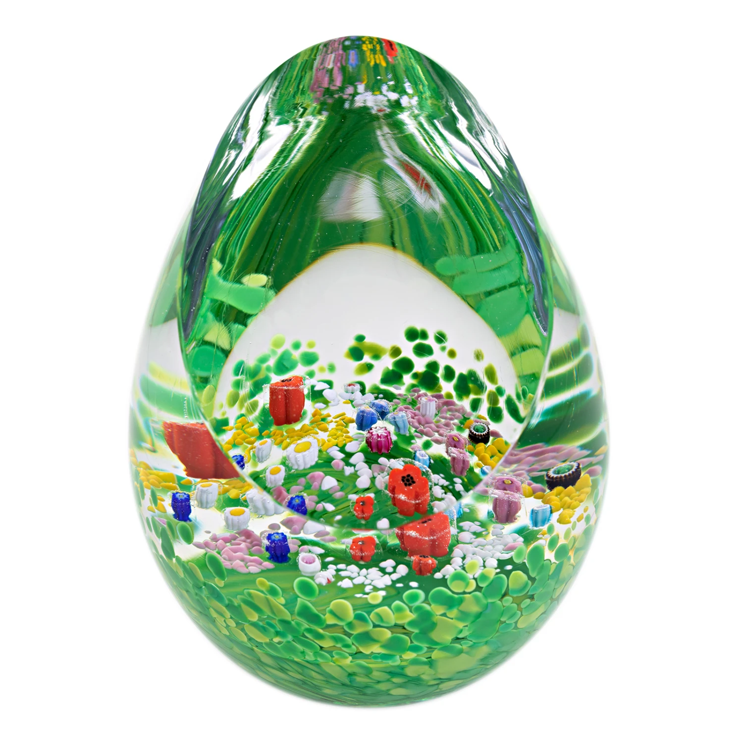 These handmade luxury paperweights are truly a sight to behold. Each one is unique, with its own colorful glass chips and Millefiori flowers. They make a beautiful addition to any home or office, and make a great gift for that special someone.
